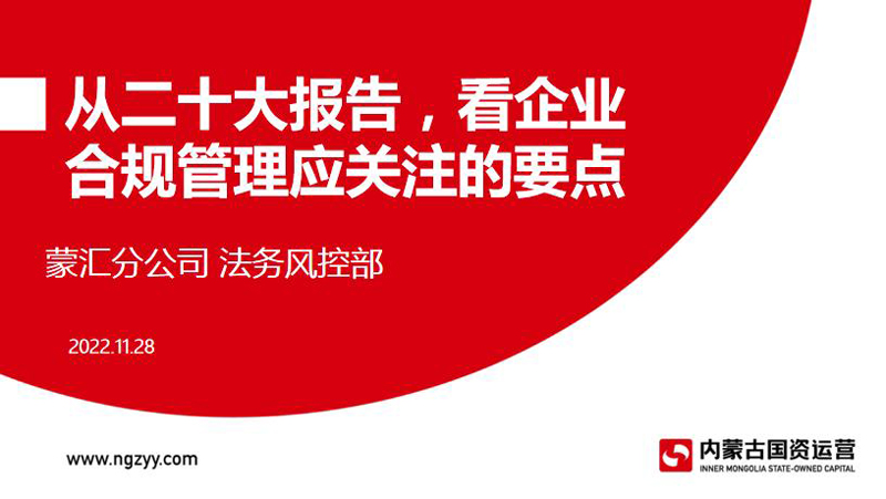 此次培训分为从历史到未来,全面依法治国是合规管理的时代背景;从中央到地方,合规管理必须坚持和加强党的全面领导;从国企到民企,高质量合规管理必须通过完善的制度来表达;从价值观到方法论,建立和培育合规文化是合规管理的“基石”四个部分,结合新颁行的《中央企业合规管理办法》及《内蒙古国有资本运营有限公司合规管理办法(试行)》的相关规定,重点宣贯了全面依法治国战略部署、坚持和加强党的领导在国有企业合规建设中的作用以及合规制度建设、合规文化建设的相关内容。